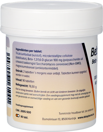 Beta-glucan 100mg Tabl 90 Deba is een voedingssupplement, verkrijgbaar in uw buurtapotheek of online apotheek. Neem niet meer dan de aanbevolen dagelijkse dosis vermeld op de verpakking. Het vervangt geen gezonde levensstijl en gevarieerde en evenwichtige voeding. Vraag raad aan uw apotheker. Het product altijd buiten het bereik van kinderen houden.