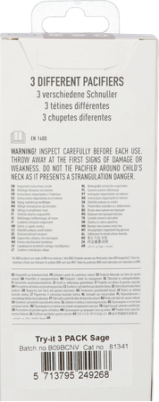 Alle fopspenen uit de Try-It-collectie worden geleverd in maat 1 (0-6 maanden). Wanneer je baby groter wordt, probeer dan voor het comfort en de veiligheid over te stappen op een grotere maat.