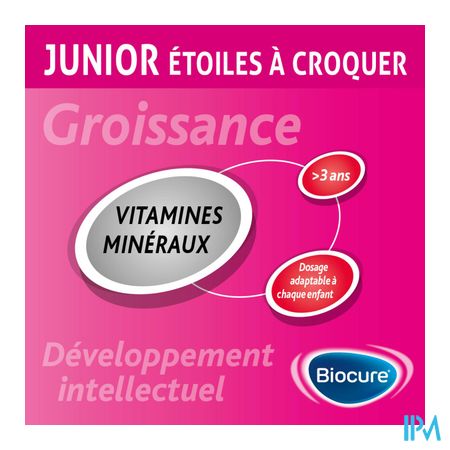 Biocure Junior Kauwsterretjes 60 St tabletten is een voedingssupplement, verkrijgbaar in uw buurtapotheek of online apotheek. Neem niet meer dan de aanbevolen dagelijkse dosis vermeld op de verpakking. Het vervangt geen gezonde levensstijl en gevarieerde en evenwichtige voeding. Vraag raad aan uw apotheker. Het product altijd buiten het bereik van kinderen houden.