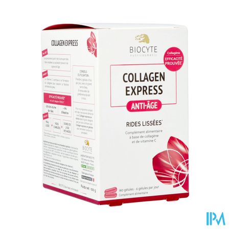Biocyte Collagen Express® capsules (huidcollageen) is een voedingssupplement met een hoge collageenconcentratie (2,5 g per 6 capsules) voor een gladde huid. Het bevat vitamine C dat bijdraagt aan de collageenvorming (om een normale huidfunctie te garanderen). Titaandioxide vrij.