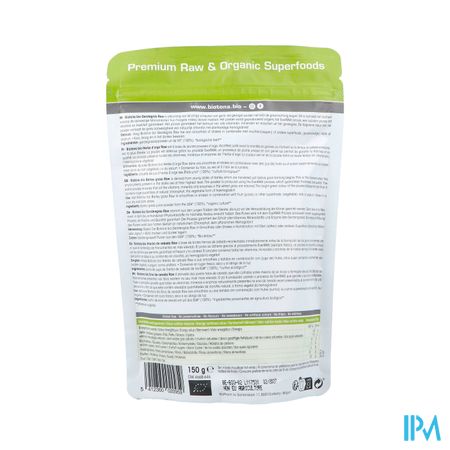 Biotona bio Gerstegrassappoeder Raw is afkomstig van de jonge scheuten van gerst, die geoogst worden net vóór de graanvorming begint. Dit is namelijk het moment waarop de aanwezige fytonutriënten hun hoogste niveau bereikt hebben. Het poeder wordt geproduceerd volgens het EverRAW proces, een subliem proces dat versheid en kwaliteit garandeert, waarbij het geperste sap in slechts 2 minuten tijd gedroogd wordt en waarbij de temperatuur altijd rond de lichaamstemperatuur blijft. Het proces van de oogst naar poeder neemt slechts 2 uur in beslag en garandeert het behoud van alle vitaminen, mineralen en enzymen uit het gerstegras. De felgroene kleur van het poeder verraadt de grote aanwezigheid van natuurlijk chlorofyl, het plantaardige hemoglobine!