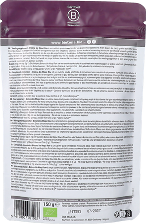 Biotona Bio Maqui Raw is een subliem poeder van piepkleine dieppaarse tot zwarte bessen, die rijkelijk groeien aan immer groenblijvende struiken in Patagonië in Zuid-Chili en Argentinië. Deze zeer smaakvolle en unieke bessen worden al eeuwenlang beschouwd als het goed bewaarde geheim van de Mapuche Indianen, de inheemse bevolking van die regio. Als enige hielden zij stand tijdens de Spaanse veroveringen en hun extreme uithoudingsvermogen zou te danken zijn aan het drinken van grote hoeveelheden thee van maqui. De paarse kleur van het poeder is te danken aan anthocyanines, stoffen die de plant produceert als bescherming tegen externe en extreme invloeden. De maquibessen voor Biotona worden in het wild geplukt in regenwouden in Chili en direct na het oogsten en selectie door middel van vriesdroging verwerkt tot een poeder, dat qua smaak, geur en kleur erg dicht aansluit bij de verse bessen. Dit droogproces zorgt er ook voor dat de natuurlijk aanwezige voedingsstoffen en fytonutriënten optimaal behouden blijven.
