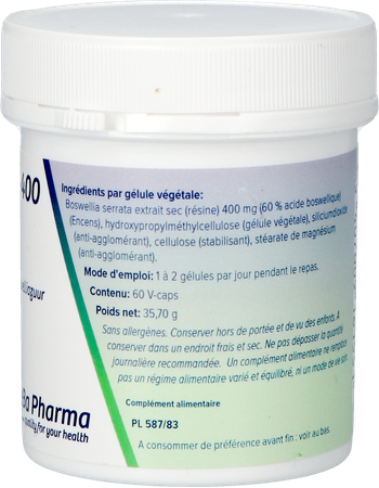 Gebruik van 2 capsules Boswellia per dag zorgt voor soepele gewrichten (EFSA-ID 3699) en ondersteunt het hart (EFSA-ID 4002). Boswellia ondersteunt een goede maag/darmfunctie en stoelgang (EFSA-ID 4003) en een normale regelmatige menstruatie (EFSA-ID 4005)