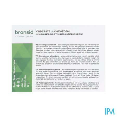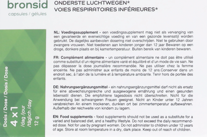 Bronsid Caps 30 is een voedingssupplement, verkrijgbaar in uw buurtapotheek of online apotheek. Neem niet meer dan de aanbevolen dagelijkse dosis vermeld op de verpakking. Het vervangt geen gezonde levensstijl en gevarieerde en evenwichtige voeding. Vraag raad aan uw apotheker. Het product altijd buiten het bereik van kinderen houden.