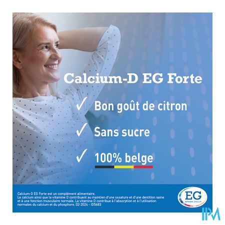 Calcium EG FORTE is een kauwtablet die 1000 mg calcium en 20 µg (800 I.E.) vitamine D3 bevat. Calcium EG FORTE is beschikbaar onder de vorm van kauwtabletten met citroensmaak of muntsmaak.