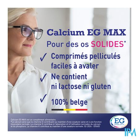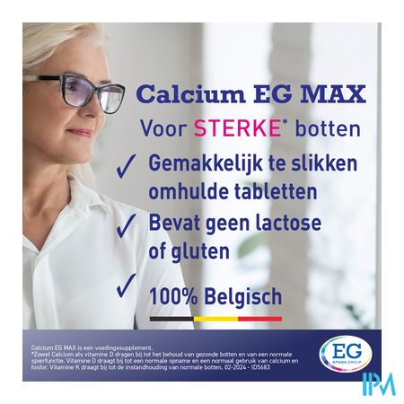 Calcium EG MAX draagt bij tot het behoud van sterke botten dankzij zijn gehalte aan calcium, vitamine D3 en vitamine K2*.
