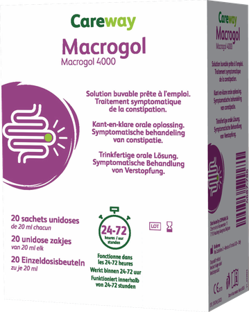 Careway Macrogol 4000 10g Zakjes Unidoses 20x20ml is een voedingssupplement, verkrijgbaar in uw buurtapotheek of online apotheek. Neem niet meer dan de aanbevolen dagelijkse dosis vermeld op de verpakking. Het vervangt geen gezonde levensstijl en gevarieerde en evenwichtige voeding. Vraag raad aan uw apotheker. Het product altijd buiten het bereik van kinderen houden.