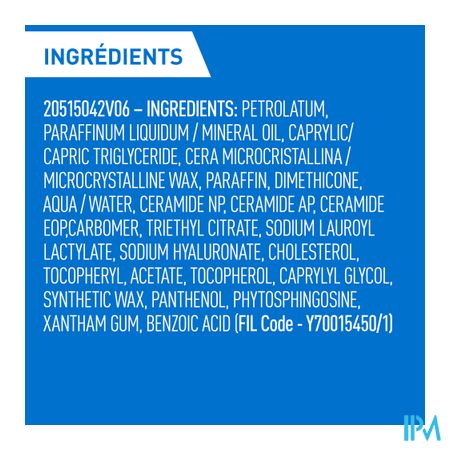 PETROLATUM • PARAFFINUM LIQUIDUM / MINERAL OIL • CERA MICROCRISTALLINA / MICROCRYSTALLINE WAX • PARAFFIN • CAPRYLIC/CAPRIC TRIGLYCERIDE • DIMETHICONE • AQUA / WATER • CERAMIDE NP • CERAMIDE AP • CERAMIDE EOP • CARBOMER • TRIETHYL CITRATE • SODIUM LAUROYL LACTYLATE • SODIUM HYALURONATE • CHOLESTEROL • TOCOPHERYL ACETATE • TOCOPHEROL • CAPRYLYL GLYCOL • SYNTHETIC WAX • PANTHENOL • PHYTOSPHINGOSINE • XANTHAN GUM • BENZOIC ACID