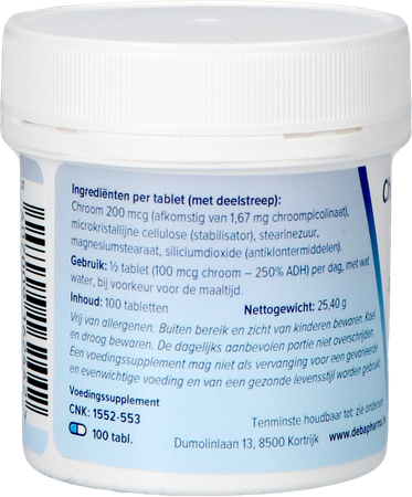 Chromium Picco 200y Comp 100 Deba is een voedingssupplement, verkrijgbaar in uw buurtapotheek of online apotheek. Neem niet meer dan de aanbevolen dagelijkse dosis vermeld op de verpakking. Het vervangt geen gezonde levensstijl en gevarieerde en evenwichtige voeding. Vraag raad aan uw apotheker. Het product altijd buiten het bereik van kinderen houden.