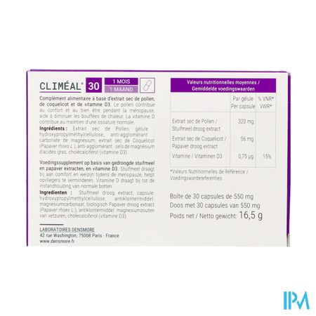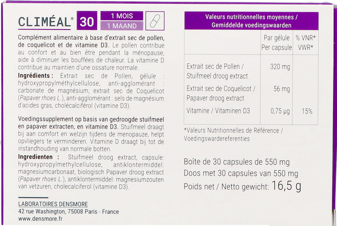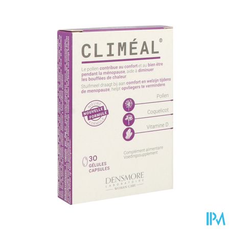 Climeal Caps 30 is een voedingssupplement, verkrijgbaar in uw buurtapotheek of online apotheek. Neem niet meer dan de aanbevolen dagelijkse dosis vermeld op de verpakking. Het vervangt geen gezonde levensstijl en gevarieerde en evenwichtige voeding. Vraag raad aan uw apotheker. Het product altijd buiten het bereik van kinderen houden.