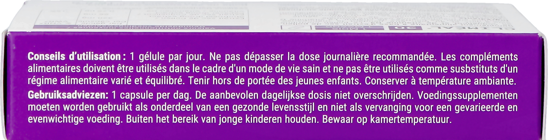 De aanbevolen dagelijkse dosis niet overschrijden. Voedingssupplementen moeten worden gebruikt als onderdeel van een gezonde levensstijl en niet ter vervanging van een gevarieerde en evenwichtige voeding. Buiten bereik van jonge kinderen houden.