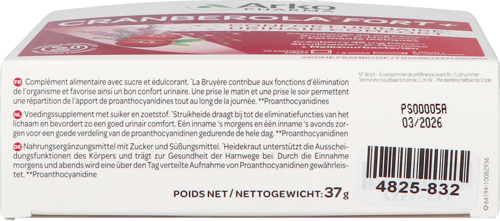 Cranberola Fort Plus Zakje 10 + Stick 5 Promo -€5 is een voedingssupplement, verkrijgbaar in uw buurtapotheek of online apotheek. Neem niet meer dan de aanbevolen dagelijkse dosis vermeld op de verpakking. Het vervangt geen gezonde levensstijl en gevarieerde en evenwichtige voeding. Vraag raad aan uw apotheker. Het product altijd buiten het bereik van kinderen houden.