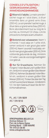 - Neem 's ochtends 1 rood zakje en 1 witte stick, samen verdund in een groot glas water (200 ml).