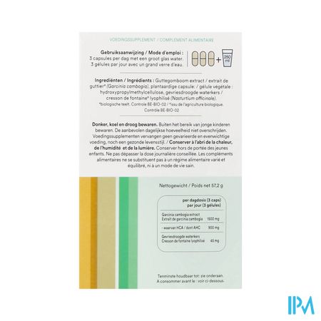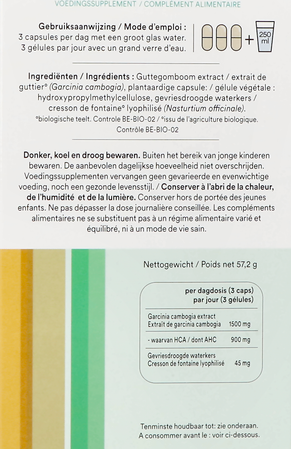 Ingrediënten per 3 capsules: 1500 mg guttegomboom extract° met 900 mg hydroxycitroenzuur of HCA (Garcinia cambogia), plantaardige capsule: hydroxypropylmethylcellulose, 45 mg gevriesdroogde waterkers° (Nasturtium officinale).
