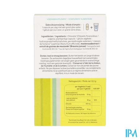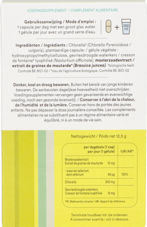 Ingrediënten per capsule: 300 mg chlorella° (Chlorella pyrenoidosa/vulgaris), plantaardige capsule: hydroxypropylmethylcellulose, 19 mg mosterdzaadextract° met 66 µg natuurlijke selenium (120% RI*) (Brassica nigra), 15 mg gevriesdroogde waterkers° (Nasturtium officinale).