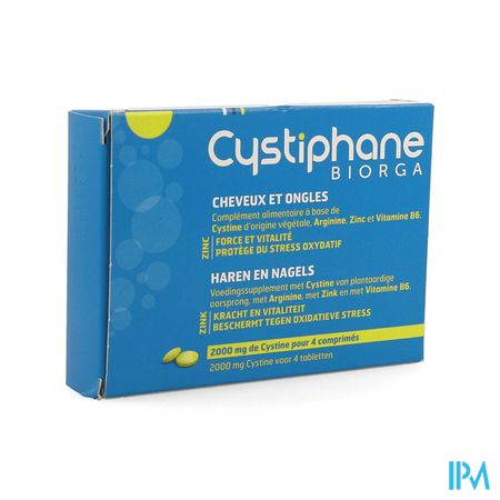 Voedingssupplement met CYSTINE van plantaardige oorsprong, met ARGININE, met ZINK en met VITAMINE B6. Cystiphane bevat aminozuren, Vitamine B6 en Zink. Vitamine B6 draagt bij tot de normale synthese van cysteïne. Zink draagt bij tot het onderhoud van normale haren en nagels en om de cellen te beschermen tegen oxidatieve stress. Uw haren en nagels behouden kracht en vitaliteit.