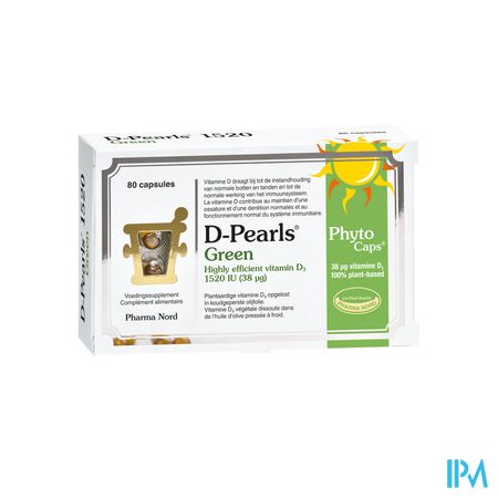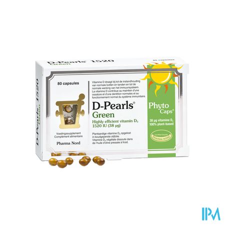 D-pearls Green 1520 V-caps 80 is een voedingssupplement, verkrijgbaar in uw buurtapotheek of online apotheek. Neem niet meer dan de aanbevolen dagelijkse dosis vermeld op de verpakking. Het vervangt geen gezonde levensstijl en gevarieerde en evenwichtige voeding. Vraag raad aan uw apotheker. Het product altijd buiten het bereik van kinderen houden.