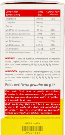 Magnesium: 200 mg (53%*), L-arginine: 400 mg, taurine: 80 mg, vitamine B3: 10 mg (63%*), vitamine B5: 2 mg (33%*), vitamine B1: 1,4 mg, vitamine B2: 1 mg (72%*), vitamine B6: 0,67 mg (48%*), vitamine B8: 150 µg (300%*), vitamine B9: 67 µg (33%*). *Voedingsreferentiewaarden."