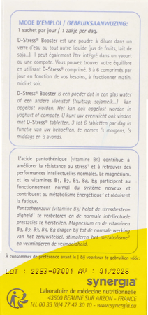 - D-Stress BOOSTER is een poeder dat moet worden verdund in een glas water of een andere vloeistof (vruchtensap, sojamelk, enz.). Het kan ook gemengd worden in yoghurt of compote.