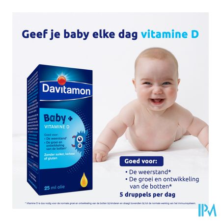 Baby's, peuters en soms ook al wat oudere kinderen hebben extra vitamine D nodig. Bij kinderen in de groei vindt namelijk de opbouw van botten in een veel sneller tempo plaats dan na die tijd. Davitamon Baby Vitamine D Olie is een oplossing van vitamine D3 in olie. Davitamon Baby Vitamine D Olie bevat geen lactose en is glutenvrij.