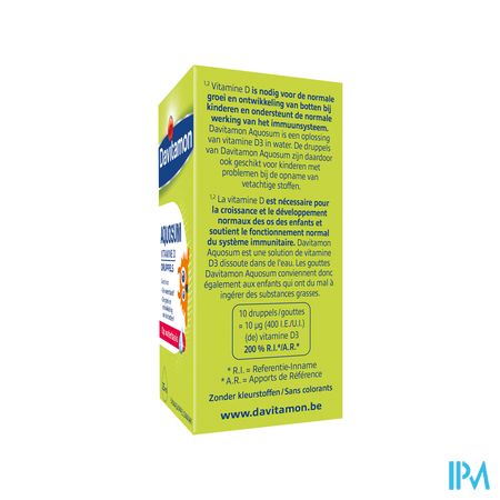 Davitamon Vitamin D Aquosum Druppels 25ml is een voedingssupplement, verkrijgbaar in uw buurtapotheek of online apotheek. Neem niet meer dan de aanbevolen dagelijkse dosis vermeld op de verpakking. Het vervangt geen gezonde levensstijl en gevarieerde en evenwichtige voeding. Vraag raad aan uw apotheker. Het product altijd buiten het bereik van kinderen houden.