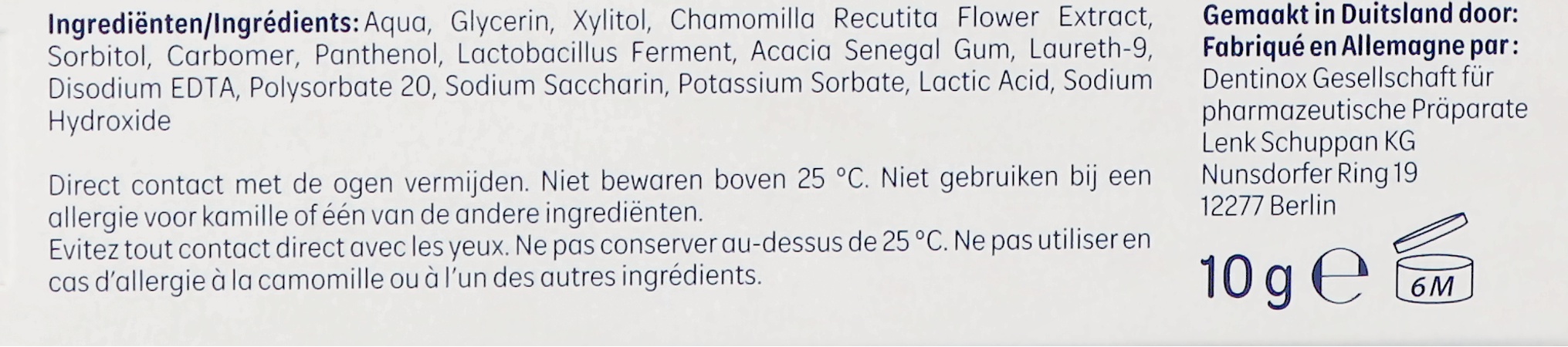 Aqua, Glycerin, Xylitol, Chamomilla Recutita Flower Extract, Sorbitol, Carbomer, Panthenol, Lactobacillus Ferment, Acacia Senegal Gum, Laureth-9, Disodium EDTA, Polysorbate 20, Sodium Saccharin, Potassium Sorbate, Lactic Acid, Sodium Hydroxide
