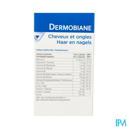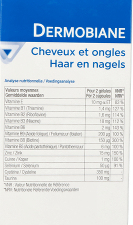 Bij elke seizoenswisseling kan het interessant zijn om supplementen te nemen om normaal haar en normale nagels te behouden. Hiertoe bevat Dermobiane Haar & Nagels cysteïne, taurine, sporenelementen (silica, zink, selenium, koper), vitamines van de B-groep en bamboepoeder.