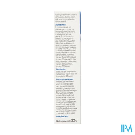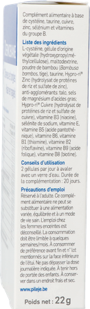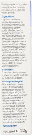 L-cysteïne, plantaardige capsule (hydroxypropylmethylcellulose), maltodextrine, bamboepoeder (Bambusa bambos, stengel), taurine, Hypro-ri®Zink (rijsteiwithydrolysaat en zinksulfaat), antiklontermiddelen: talk, magnesiumzouten van vetzuren; Hypro-ri® Koper (rijsteiwithydrolysaat en kopersulfaat), vitamine B3 (niacine), natriumseleniet, vitamine E, vitamine B5 (pantotheenzuur), vitamine B6, vitamine B1 (thiamine), vitamine B2 (riboflavine), vitamine B9 (foliumzuur), vitamine B8 (biotine).