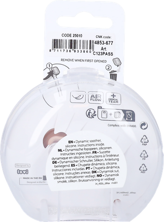 Het dynamische zuiggedeelte is opgebouwd uit meerdere lagen siliconen van verschillende diktes. Hierdoor rekt het zuiggedeelte zich uit en trekt het samen op het zuigritme van je baby. De Prime fopspeen is hiermee niet alleen veilig, maar ook effectief in het ondersteunen van de natuurlijke zuigbehoefte van je kindje. De symmetrische vorm van het zuiggedeelte imiteert de moedertepel voor een vertrouwd en veilig gevoel.