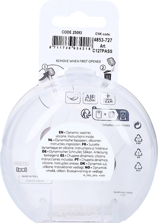 Het dynamische zuiggedeelte is opgebouwd uit meerdere lagen siliconen van verschillende diktes. Hierdoor rekt het zuiggedeelte zich uit en trekt het samen op het zuigritme van je baby. De Prime fopspeen is hiermee niet alleen veilig, maar ook effectief in het ondersteunen van de natuurlijke zuigbehoefte van je kindje. De symmetrische vorm van het zuiggedeelte imiteert de moedertepel voor een vertrouwd en veilig gevoel.