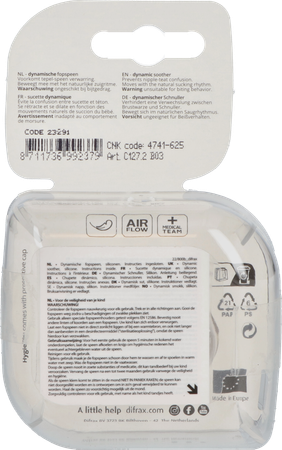 De Dynamische fopspeen is gemaakt van hoogwaardige siliconen en is smaak- en geurvrij. Dit is extra belangrijk voor baby's die in het begin gevoelig zijn voor prikkels van buitenaf. Dankzij het speciale schildje kan je baby tijdens het gebruik vrij ademen door de neus.