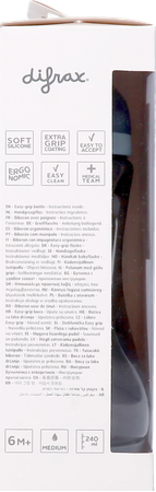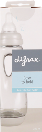 In de bodem van de handgreepfles zit een uniek Anti-colic ventiel. Dit voorkomt vacuüm zuigen en vermindert de kans op boeren, spugen en darmkrampjes. De flessenspeen heeft een zachte afwerking. Door de afschroefbare bodem is de babyfles makkelijk schoon te maken. Ontwikkeld door Difrax medisch team.