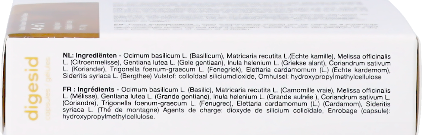Digesid Caps 30 is een voedingssupplement, verkrijgbaar in uw buurtapotheek of online apotheek. Neem niet meer dan de aanbevolen dagelijkse dosis vermeld op de verpakking. Het vervangt geen gezonde levensstijl en gevarieerde en evenwichtige voeding. Vraag raad aan uw apotheker. Het product altijd buiten het bereik van kinderen houden.