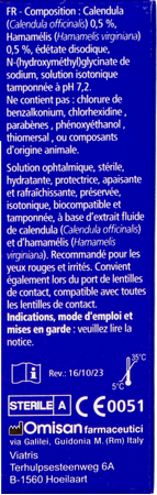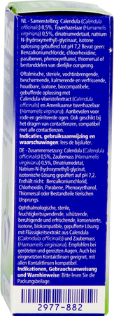 Oftalmische, steriele, vochtinbrengende, beschermende, kalmerende en verfrissende, houdbare, isotone, biocompatibele, gebufferde oplossing met Calendula-vloeistofextract (Calendula officinalis) en Amerikaanse toverhazelaar (Hamamelis virginiana). Aanbevolen voor rode en geïrriteerde ogen. Ook geschikt bij het dragen van contactlenzen, compatibel met alle contactlenzen.