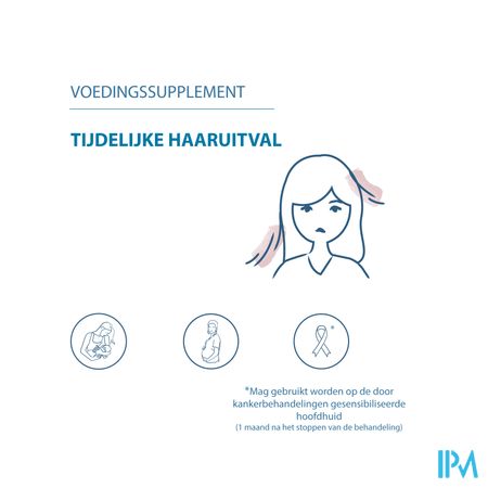 MEER INFORMATIE • Dit voedingssupplement mag niet worden gebruikt ter vervanging van een gevarieerde en evenwichtige voeding en een gezonde levensstijl. • Best gebruiken vóór de datum vermeld op de doos en bewaren op een koele, droge plaats uit de buurt van licht. • Kan worden gebruikt op de door kankerbehandelingen verzwakte hoofdhuid*.