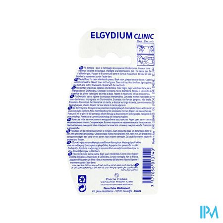 ELGYDIUM Clinic dental floss is dun en resistent en is voor het gemak gewaxt. Het flosdraad is geïmpregneerd met chloorhexidine (een actief ingrediënt met reinigende eigenschappen) en helpt met beschermen tegen cariës. De beste manier om dit te doen is 40 centimeter flosdraad af te knippen met het mesje dat is geïntegreerd in de flosdispenser, de uiteinden van het ELGYDIUM Clinic dental floss om uw wijsvingers te wikkelen en het, strak geleid door uw duimen, tussen uw tanden en kiezen te plaatsen. Het flosdraad is niet-gearomatiseerd, zacht voor het tandvlees en wordt bijzonder aanbevolen voor mensen met implantaten of blootliggende tandhalzen.