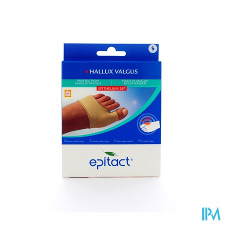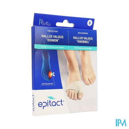Epitact® heeft een hallux valgus bescherming ontwikkeld die bestaat uit een gelkussentje van Epithelium 26® waardoor de druk en de wrijvingen ter hoogte van de "knobbel" beperkt worden. Op deze manier wordt de pijn verlicht en de vorming van eelt vermeden.