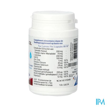 Antiklontermiddelen: dicalciumfosfaat, magnesiumzouten van vetzuren; L-carnitinetartraat, extracten van Ceylon-kaneel (Cinnamomum verum J.Presl) en mariadistel (Silybum marianum Gaertn.), co-enzym Q10 (ubiquinon), zinkgluconaat, vitamine E (D-alfatocoferylzuursuccinaat), natriumseleniet, chroomchloride, vitamines B12 (methylcobalamine), B6 (pyridoxinehydrochloride) en B9 (calcium-L-methylfolaat). Plantaardige capsule (hydroxypropylmethylcellulose).
