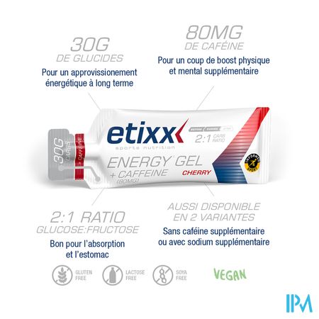 Etixx Energy Gel Caffeine Cherry 12x40ml is een voedingssupplement, verkrijgbaar in uw buurtapotheek of online apotheek. Neem niet meer dan de aanbevolen dagelijkse dosis vermeld op de verpakking. Het vervangt geen gezonde levensstijl en gevarieerde en evenwichtige voeding. Vraag raad aan uw apotheker. Het product altijd buiten het bereik van kinderen houden.