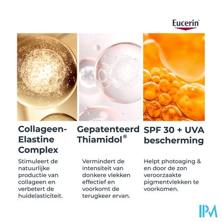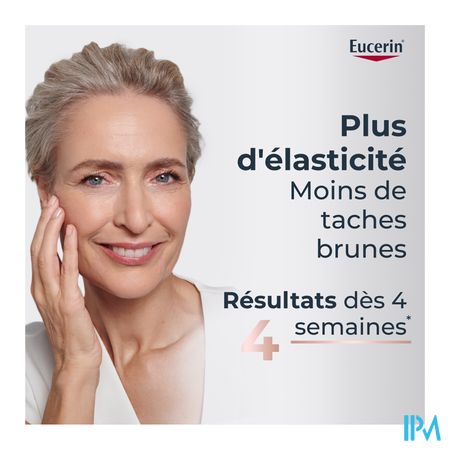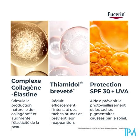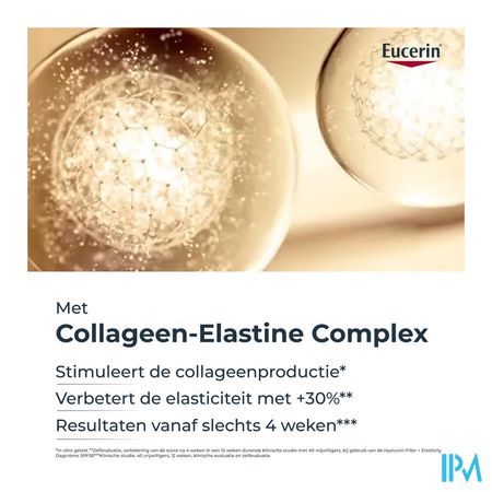 Het Collageen-Elastine Complex, een krachtige combinatie van arctiin en creatine, stimuleert de productie van collageen (in vitro tests) en verhoogt de elasticiteit van de huid. Het gepatenteerde thiamidol* van Eucerin vermindert donkere vlekken als gevolg van de leeftijd.