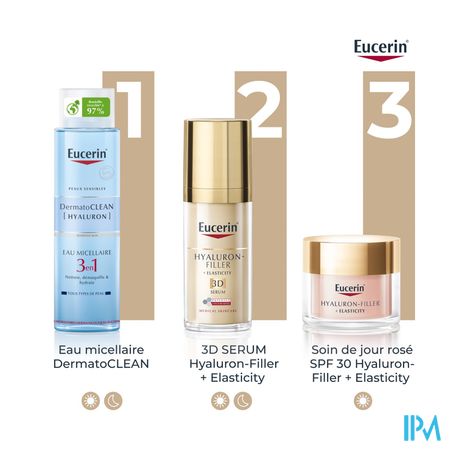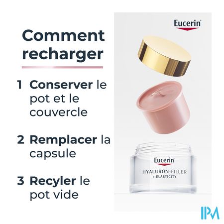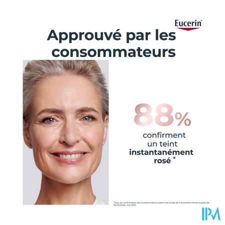 De zeer lichtroze kleur gaat voornamelijk 's ochtends een doffe en vermoeid uitziende huid tegen voor een rozige, stralende en frisse teint. Deze unieke formule geeft een natuurlijke, rozige gloed en biedt talrijke anti-age voordelen: het specifieke mengsel van Eucerin dat hoog- en laagmoleculair hyaluronzuur bevat, vult zichtbaar diepe rimpels op.