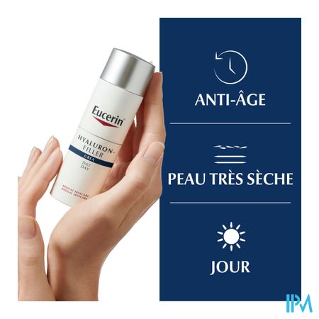 Eucerin Hyaluron-Filler Extra Rijk Antirimpel Dagcrème biedt intensieve hydratatie en vermindert droogtelijntjes en rimpels met 5% Ureum en Hyaluronzuur.