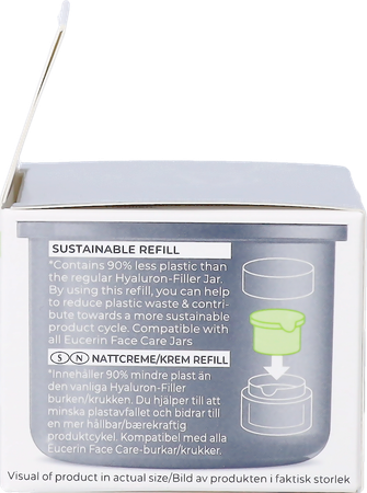 Bevat 90% minder plastic dan de reguliere Hyaluron-Filler potjes. Door gebruik te maken van deze navulling helpt u mee om plastic afval te verminderen. Te gebruiken voor alle Eucerin gezichtsverzorgings potjes.