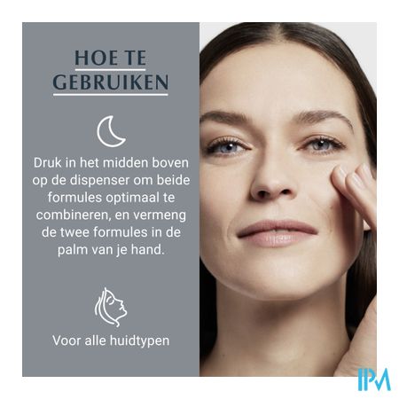 Breng eenmaal per dag 's avonds aan op een schoon gezicht, schone hals en schoon decolleté. Druk in het midden boven op de dispenser om beide formules optimaal te combineren. Vermeng de twee formules in de palm van je hand.