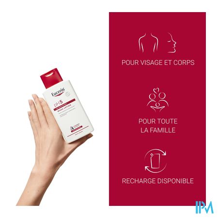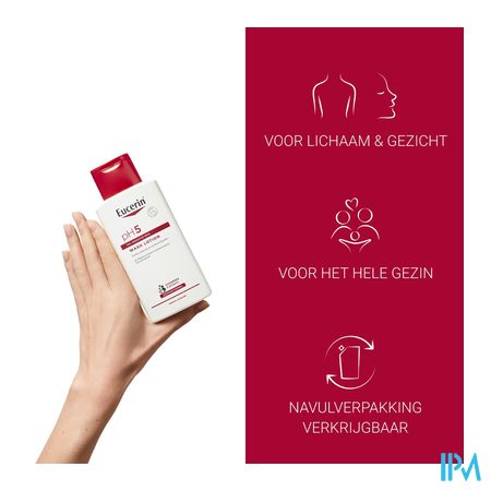 Eucerin pH5 Waslotion is een dagdagelijkse gezichts- en lichaamsreiniging die vrij is van alkalische zeep. Extra milde oppervlakte-actieve stoffen zorgen ervoor dat de droge, gevoelige huid zacht maar effectief wordt gereinigd. Het unieke Eucerin pH Balance System geeft de reiniging de optimale pH-waarde om de natuurlijke weerstand van de huid te beschermen, de veerkracht te behouden en uitdroging te voorkomen. Het is ook geschikt voor baby's en kinderen.