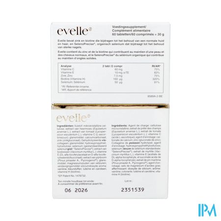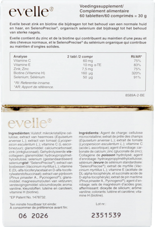 Evelle Tabl 60 is een voedingssupplement, verkrijgbaar in uw buurtapotheek of online apotheek. Neem niet meer dan de aanbevolen dagelijkse dosis vermeld op de verpakking. Het vervangt geen gezonde levensstijl en gevarieerde en evenwichtige voeding. Vraag raad aan uw apotheker. Het product altijd buiten het bereik van kinderen houden.
