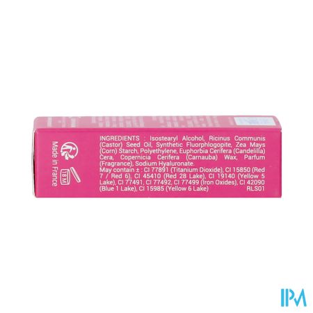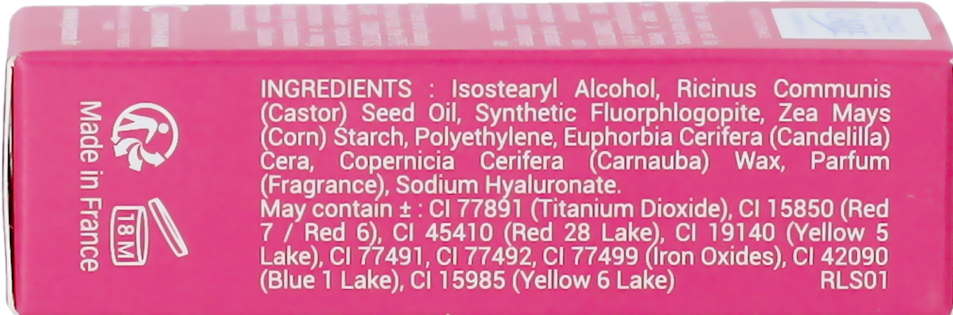 INGREDIENTS : Ricinus Communis (Castor) Seed Oil, Polybutene, Octyldodecanol, Bis-Diglyceryl Polyacyladipate-2, Hydrogenated Polydecene, Polyglyceryl-2 Triisostearate, Synthetic Fluorphlogopite, Zea Mays (Corn) Starch, Oryza Sativa (Rice) Bran Wax, C12-15 Alkyl Benzoate, Synthetic Wax, Myristyl Lactate, Ethylene/Propylene Copolymer, Butyrospermum Parkii (Shea Butter), Parfum (Fragrance), Stearalkonium Hectorite, Propylene Carbonate, Tocopherol, Ammonium Glycyrrhizate. May contain: CI 77891 (Titanium Dioxide), CI 15850 (Red 7 / Red 6), CI 45410 (Red 28 Lake), CI 19140 (Yellow 5 Lake), CI 77491, CI 77492, CI 77499 (Iron Oxides), CI 42090 (Blue 1 Lake), CI 15985 (Yellow 6 Lake) RLS02