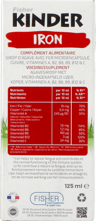 Fisher Kinder Ijzer Siroop 125ml is een voedingssupplement, verkrijgbaar in uw buurtapotheek of online apotheek. Neem niet meer dan de aanbevolen dagelijkse dosis vermeld op de verpakking. Het vervangt geen gezonde levensstijl en gevarieerde en evenwichtige voeding. Vraag raad aan uw apotheker. Het product altijd buiten het bereik van kinderen houden.