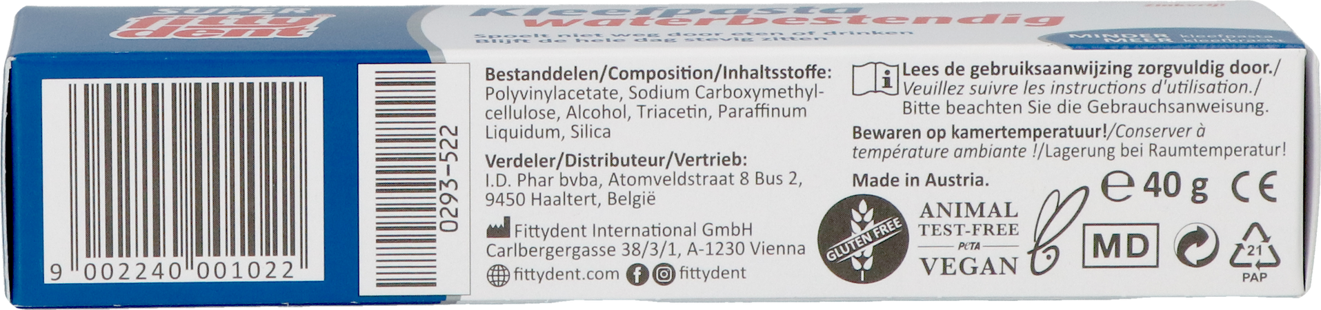 Fittydent Kleefpasta is de enige prothese lijm wereldwijd die waterbestendig is, waardoor deze niet gaat schuiven tijdens het eten en drinken. Het zorgt voor een zeer sterke hechting, zodat de prothese de hele dag goed blijft bevestigd aan het tandvlees. Fittydent Kleefpasta geeft u de vrijheid en het vertrouwen om de hele dag vrijuit te spreken en te lachen en om te eten en te drinken zonder zorgen of schaamte.