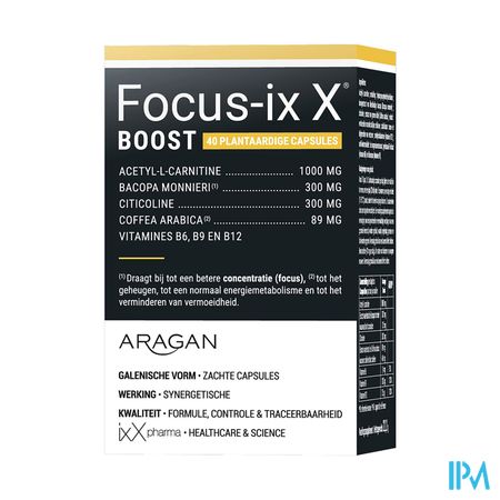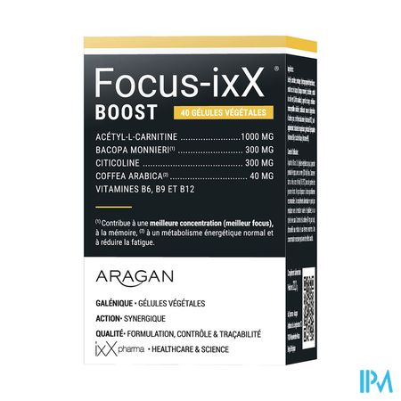 Focus-ixx Boost Caps 40 is een voedingssupplement, verkrijgbaar in uw buurtapotheek of online apotheek. Neem niet meer dan de aanbevolen dagelijkse dosis vermeld op de verpakking. Het vervangt geen gezonde levensstijl en gevarieerde en evenwichtige voeding. Vraag raad aan uw apotheker. Het product altijd buiten het bereik van kinderen houden.